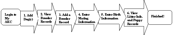 This QuickStart guide is designed to help you setup records, including adding dogs and breeding records, entering mating and birth information, and viewing litter and puppy information. The graphic below is designed to give you an idea of the sequence of steps necessary to perform basic functionality.