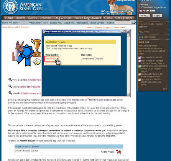 Choose the dog you want from the results list by clicking on the registration number. This will return you to the screen shown in
