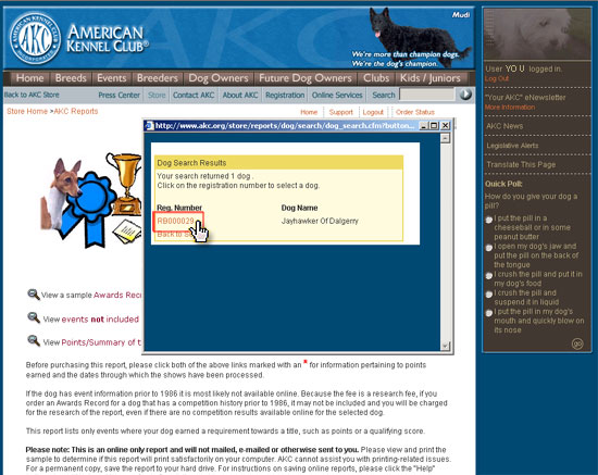 Step 6 - Choose the dog you want from the results list by clicking on the registration number. This will return you to the screen shown in