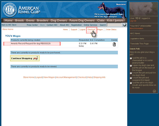 | Previous | Step 8 - You can verify that the report you are looking for is being created for the dog you want - In this case an Awards Record for dog RB00029. If it is not correct, then you can remove the report by clicking on the trash can. After 30-60 seconds, you should see the screen update and show the report move from the "Products Currently Being Created" section to the "Products Ready to be Purchased" section. If it is complete, you can click on the check-out link to proceed to the checkout screen, complete payment, and then view the report. |
